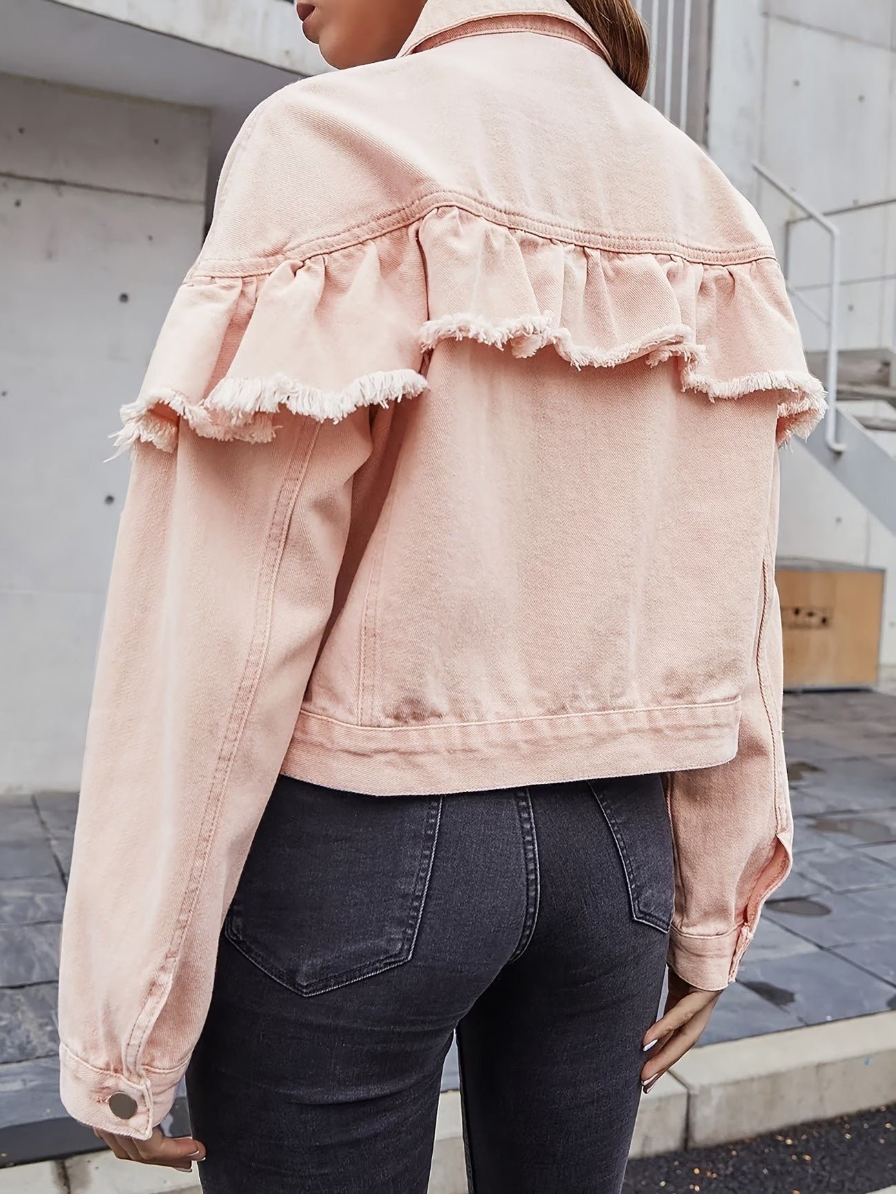 This women’s jacket features a pointed collar and a full-button front closure with several buttons. A ruffled panel wraps around the chest, shoulders, and back, finished with a frayed trim. The jacket includes long sleeves with buttoned cuffs and a straight hemline.